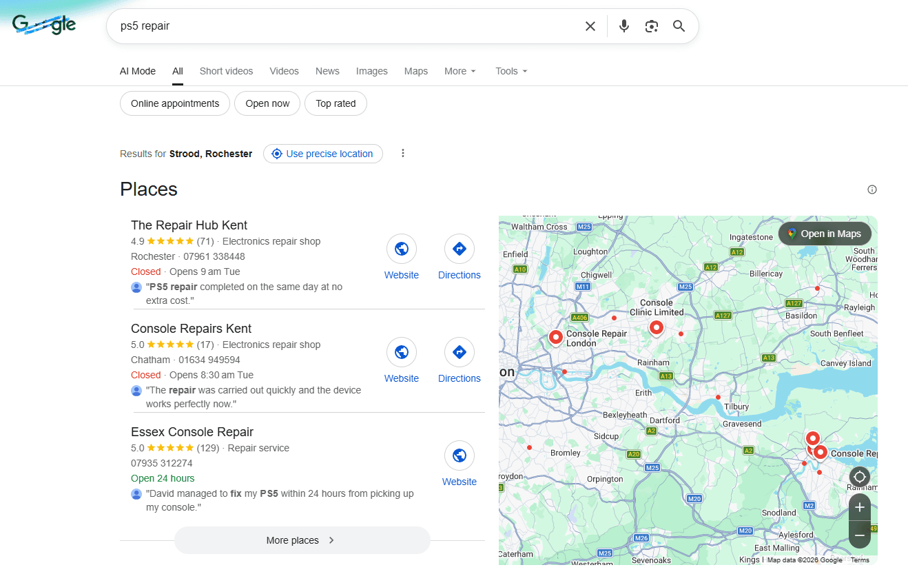 “After relocating to Kent we needed to start this business from scratch. Using the guidance and knowledge from Review Velocity, we quickly ranked on Google maps for all of our Console Repair Service Keywords. We now get hundreds of calls per month all due to the guidance and software provided by Review Velocity.”